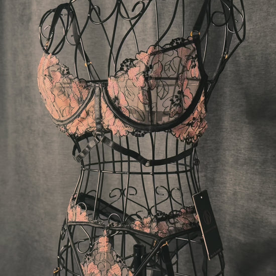 Composé d’un soutien-gorge longline en dentelle brodée et d’un string à jarretelles, cet ensemble révèle vos courbes grâce à ses découpes graphiques et ses jeux de transparence.